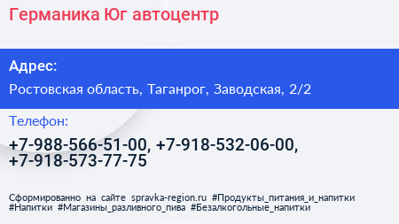 Германика-Юг, автоцентр по адресу Ростовская область, Таганрог, Заводская, 2/2 в дальнейшем Организация, размещена в следующих категориях:
