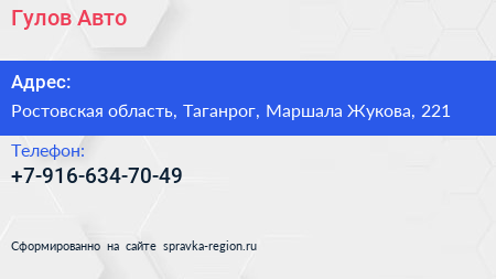 Гулов-Авто по адресу Ростовская область, Таганрог, Маршала Жукова, 221 в дальнейшем Организация, размещена в следующих категориях: