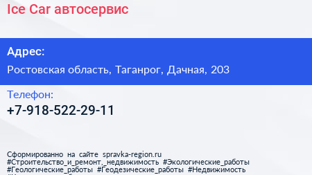 Ice Car, автосервис по адресу Ростовская область, Таганрог, Дачная, 203 в дальнейшем Организация, размещена в следующих категориях: