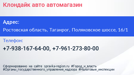 Клондайк авто, автомагазин по адресу Ростовская область, Таганрог, Поляковское шоссе, 16/1 в дальнейшем Организация, размещена в следующих категориях: