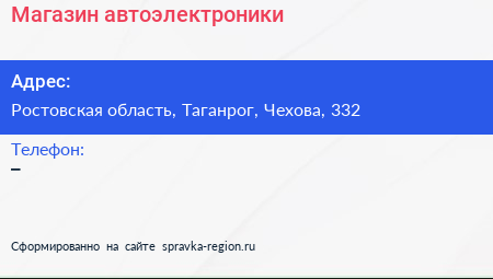Магазин автоэлектроники по адресу Ростовская область, Таганрог, Чехова, 332 в дальнейшем Организация, размещена в следующих категориях: