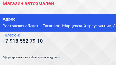 Магазин автоэмалей по адресу Ростовская область, Таганрог, Марцевский треугольник, 3 в дальнейшем Организация, размещена в следующих категориях: