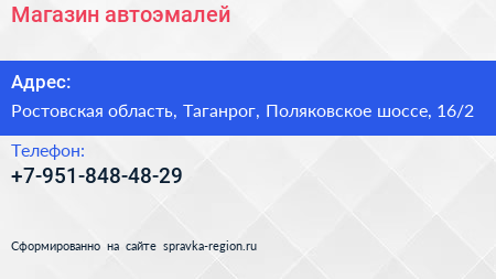 Магазин автоэмалей по адресу Ростовская область, Таганрог, Поляковское шоссе, 16/2 в дальнейшем Организация, размещена в следующих категориях: