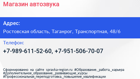 Магазин автозвука по адресу Ростовская область, Таганрог, Транспортная, 48/6 в дальнейшем Организация, размещена в следующих категориях:
