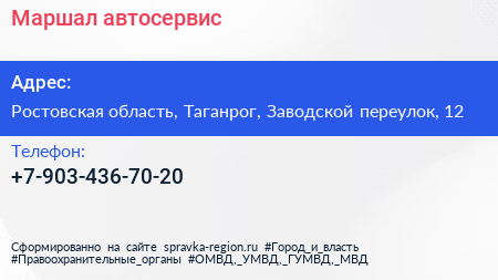 Маршал, автосервис по адресу Ростовская область, Таганрог, Заводской переулок, 12 в дальнейшем Организация, размещена в следующих категориях:
