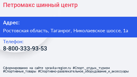 Петромакс, шинный центр по адресу Ростовская область, Таганрог, Николаевское шоссе, 1а в дальнейшем Организация, размещена в следующих категориях: