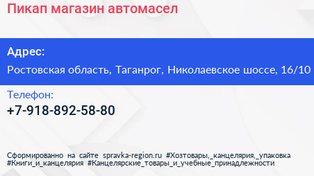 Пикап, магазин автомасел по адресу Ростовская область, Таганрог, Николаевское шоссе, 16/10 в дальнейшем Организация, размещена в следующих категориях: