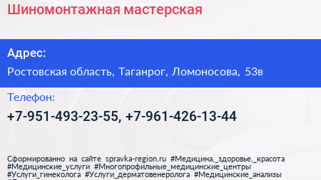 Шиномонтажная мастерская по адресу Ростовская область, Таганрог, Ломоносова, 53в в дальнейшем Организация, размещена в следующих категориях: