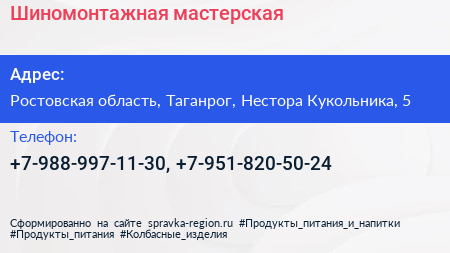 Шиномонтажная мастерская по адресу Ростовская область, Таганрог, Нестора Кукольника, 5 в дальнейшем Организация, размещена в следующих категориях: