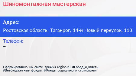 Шиномонтажная мастерская по адресу Ростовская область, Таганрог, 14-й Новый переулок, 113 в дальнейшем Организация, размещена в следующих категориях: