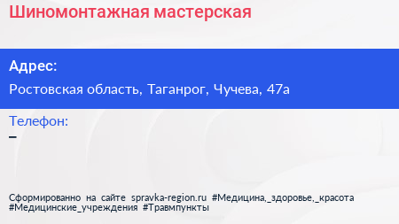 Шиномонтажная мастерская по адресу Ростовская область, Таганрог, Чучева, 47а в дальнейшем Организация, размещена в следующих категориях: