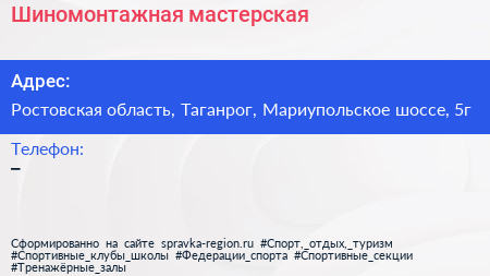 Шиномонтажная мастерская по адресу Ростовская область, Таганрог, Мариупольское шоссе, 5г в дальнейшем Организация, размещена в следующих категориях: