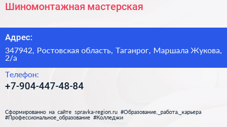Шиномонтажная мастерская по адресу 347942, Ростовская область, Таганрог, Маршала Жукова, 2/а в дальнейшем Организация, размещена в следующих категориях: