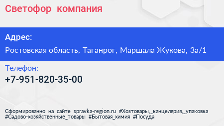 Светофор+, компания по адресу Ростовская область, Таганрог, Маршала Жукова, 3а/1 в дальнейшем Организация, размещена в следующих категориях:
