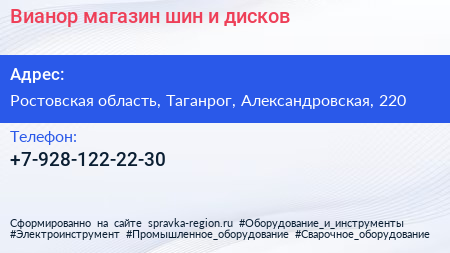 Вианор, магазин шин и дисков по адресу Ростовская область, Таганрог, Александровская, 220 в дальнейшем Организация, размещена в следующих категориях: