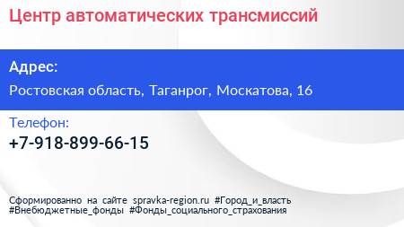 Центр автоматических трансмиссий по адресу Ростовская область, Таганрог, Москатова, 16 в дальнейшем Организация, размещена в следующих категориях: