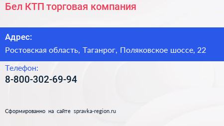 Бел-КТП, торговая компания по адресу Ростовская область, Таганрог, Поляковское шоссе, 22 в дальнейшем Организация, размещена в следующих категориях: