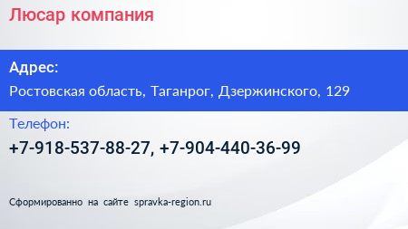 Люсар, компания по адресу Ростовская область, Таганрог, Дзержинского, 129 в дальнейшем Организация, размещена в следующих категориях: