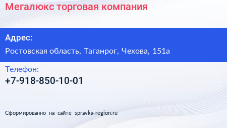 Мегалюкс, торговая компания по адресу Ростовская область, Таганрог, Чехова, 151а в дальнейшем Организация, размещена в следующих категориях: