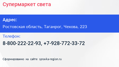 Супермаркет света по адресу Ростовская область, Таганрог, Чехова, 223 в дальнейшем Организация, размещена в следующих категориях: