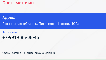 Свет+, магазин по адресу Ростовская область, Таганрог, Чехова, 108а в дальнейшем Организация, размещена в следующих категориях: