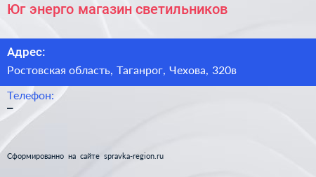 Юг энерго, магазин светильников по адресу Ростовская область, Таганрог, Чехова, 320в в дальнейшем Организация, размещена в следующих категориях: