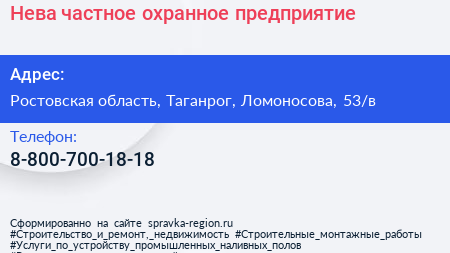 Нева, частное охранное предприятие по адресу Ростовская область, Таганрог, Ломоносова, 53/в в дальнейшем Организация, размещена в следующих категориях: