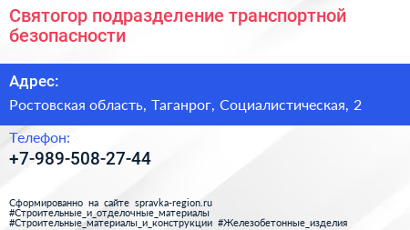 Святогор, подразделение транспортной безопасности по адресу Ростовская область, Таганрог, Социалистическая, 2 в дальнейшем Организация, размещена в следующих категориях: