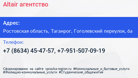 Altair, агентство по адресу Ростовская область, Таганрог, Гоголевский переулок, 6а в дальнейшем Организация, размещена в следующих категориях: