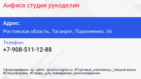 Анфиса, студия рукоделия по адресу Ростовская область, Таганрог, Пархоменко, 56 в дальнейшем Организация, размещена в следующих категориях:
