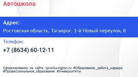 Автошкола по адресу Ростовская область, Таганрог, 1-й Новый переулок, 8 в дальнейшем Организация, размещена в следующих категориях: