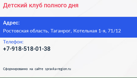 Детский клуб полного дня по адресу Ростовская область, Таганрог, Котельная 1-я, 71/12 в дальнейшем Организация, размещена в следующих категориях: