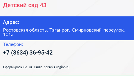 Детский сад №43 по адресу Ростовская область, Таганрог, Смирновский переулок, 101а в дальнейшем Организация, размещена в следующих категориях: