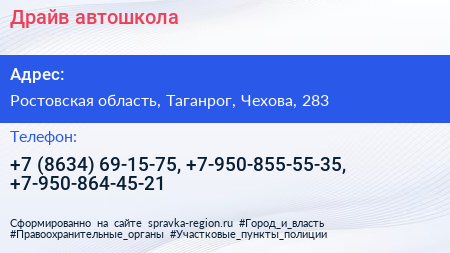 Драйв, автошкола по адресу Ростовская область, Таганрог, Чехова, 283 в дальнейшем Организация, размещена в следующих категориях: