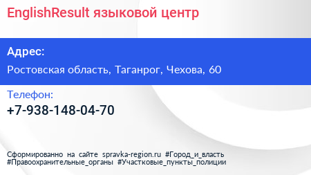 EnglishResult, языковой центр по адресу Ростовская область, Таганрог, Чехова, 60 в дальнейшем Организация, размещена в следующих категориях: