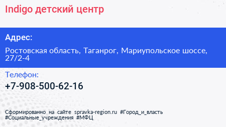 Indigo, детский центр по адресу Ростовская область, Таганрог, Мариупольское шоссе, 27/2-4 в дальнейшем Организация, размещена в следующих категориях: