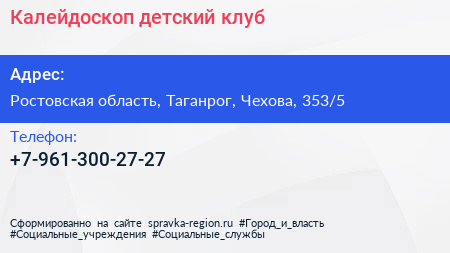 Калейдоскоп, детский клуб по адресу Ростовская область, Таганрог, Чехова, 353/5 в дальнейшем Организация, размещена в следующих категориях: