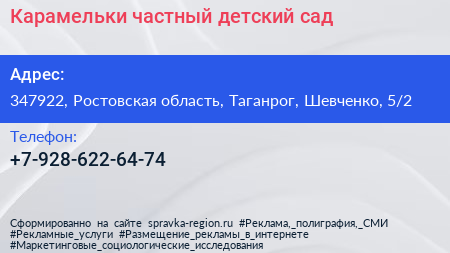 Карамельки, частный детский сад по адресу 347922, Ростовская область, Таганрог, Шевченко, 5/2 в дальнейшем Организация, размещена в следующих категориях: