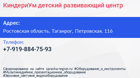 КиндериУм, детский развивающий центр по адресу Ростовская область, Таганрог, Петровская, 116 в дальнейшем Организация, размещена в следующих категориях: