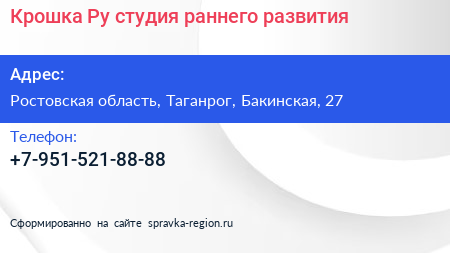 Крошка Ру, студия раннего развития по адресу Ростовская область, Таганрог, Бакинская, 27 в дальнейшем Организация, размещена в следующих категориях: