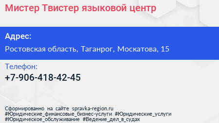 Мистер Твистер, языковой центр по адресу Ростовская область, Таганрог, Москатова, 15 в дальнейшем Организация, размещена в следующих категориях: