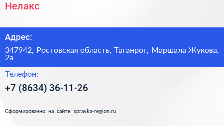 Нелакс по адресу 347942, Ростовская область, Таганрог, Маршала Жукова, 2а в дальнейшем Организация, размещена в следующих категориях: