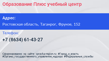 Образование Плюс, учебный центр по адресу Ростовская область, Таганрог, Фрунзе, 152 в дальнейшем Организация, размещена в следующих категориях: