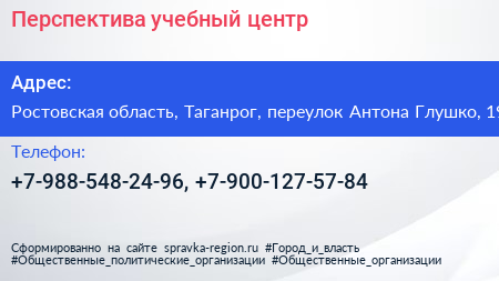 Перспектива, учебный центр по адресу Ростовская область, Таганрог, переулок Антона Глушко, 19 в дальнейшем Организация, размещена в следующих категориях: