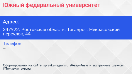 Южный федеральный университет по адресу 347922, Ростовская область, Таганрог, Некрасовский переулок, 44 в дальнейшем Организация, размещена в следующих категориях: