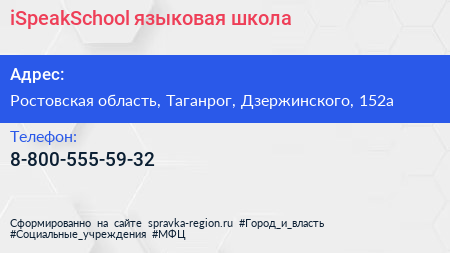 iSpeakSchool, языковая школа по адресу Ростовская область, Таганрог, Дзержинского, 152а в дальнейшем Организация, размещена в следующих категориях: