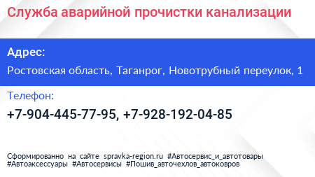 Служба аварийной прочистки канализации по адресу Ростовская область, Таганрог, Новотрубный переулок, 1 в дальнейшем Организация, размещена в следующих категориях: