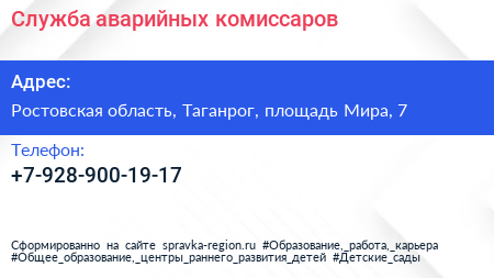 Служба аварийных комиссаров по адресу Ростовская область, Таганрог, площадь Мира, 7 в дальнейшем Организация, размещена в следующих категориях: