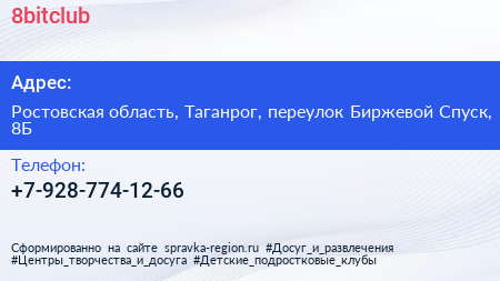 8bitclub по адресу Ростовская область, Таганрог, переулок Биржевой Спуск, 8Б в дальнейшем Организация, размещена в следующих категориях: