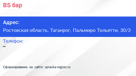 BS, бар по адресу Ростовская область, Таганрог, Пальмиро Тольятти, 30/3 в дальнейшем Организация, размещена в следующих категориях: